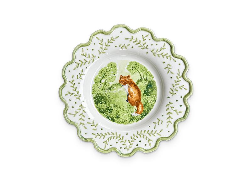 High fired porcelain that depicts a clever fox amidst green foliage. Microwave and dishwasher safe.