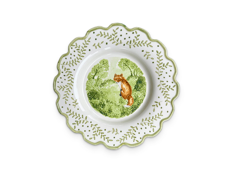 High fired porcelain that depicts a clever fox amidst green foliage. Microwave and dishwasher safe.